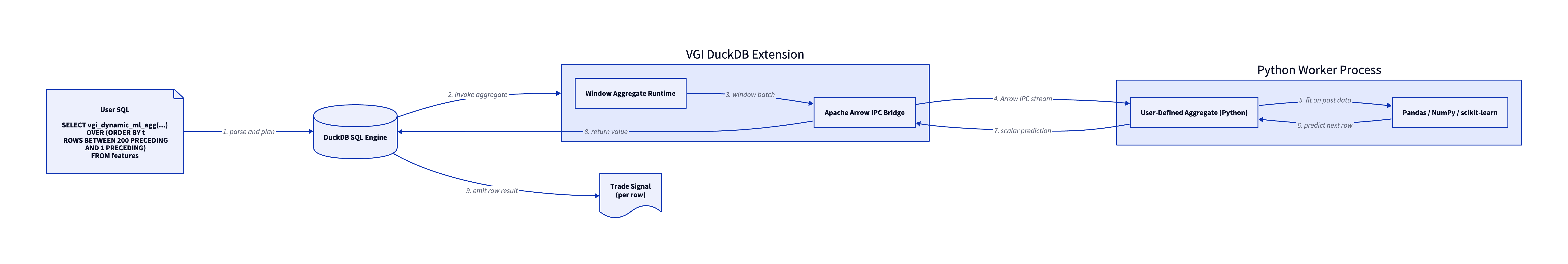 This function is defined in Python, executes inside a worker process via the VGI DuckDB extension, and runs as a window aggregate over historical rows. The window structure is what makes the backtest leak-free: the model only ever sees rows that occurred strictly before the row it’s predicting.