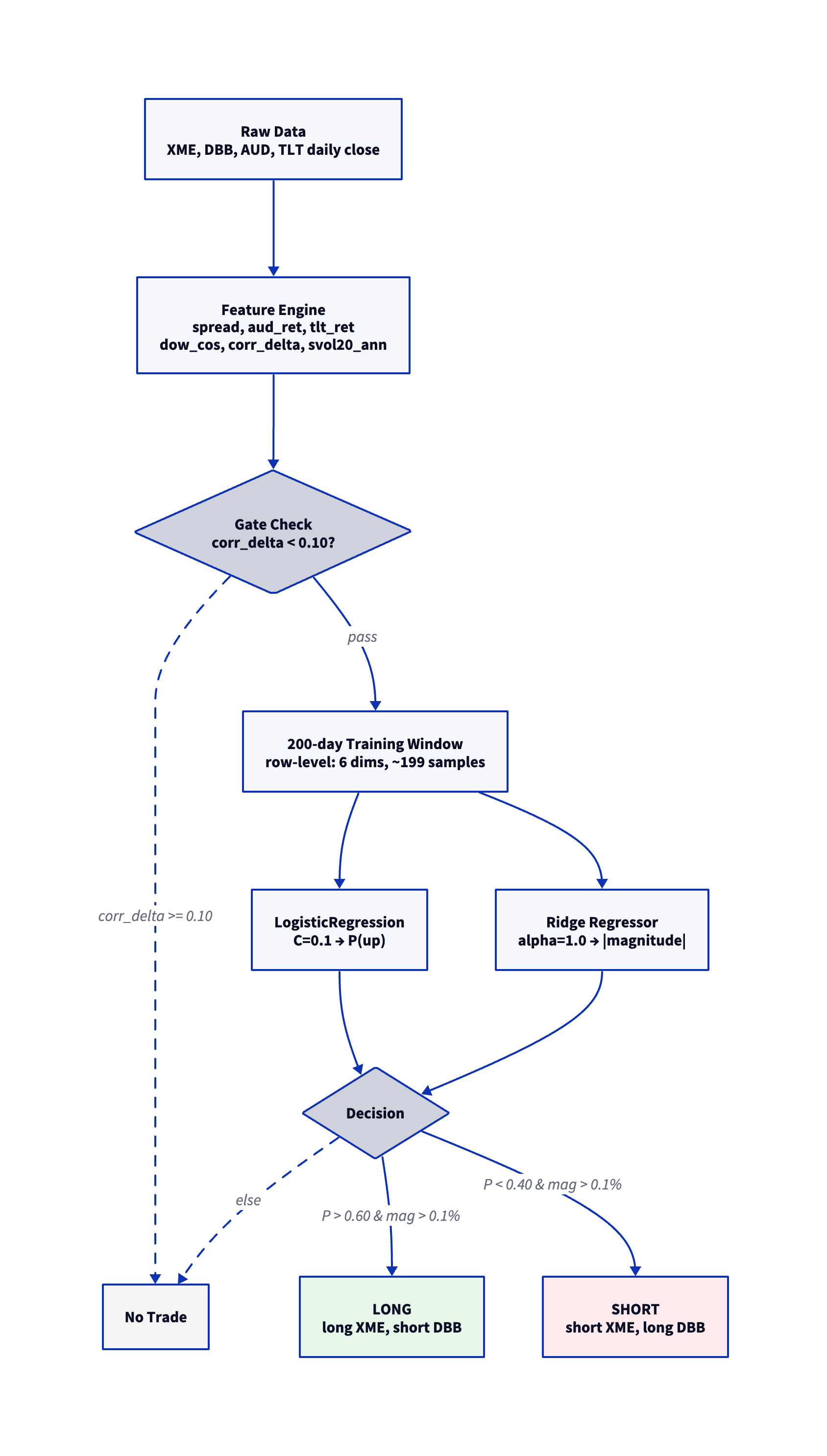 This document presents a systematic pairs trading strategy on the XME (SPDR S&P Metals & Mining ETF) vs DBB (Invesco DB Base Metals Fund) spread. The strategy uses a row-level dual-model architecture — logistic regression for direction and ridge regression for magnitude — trained on 6 features with a 200-day rolling window, regime-based gating, and binary position sizing.