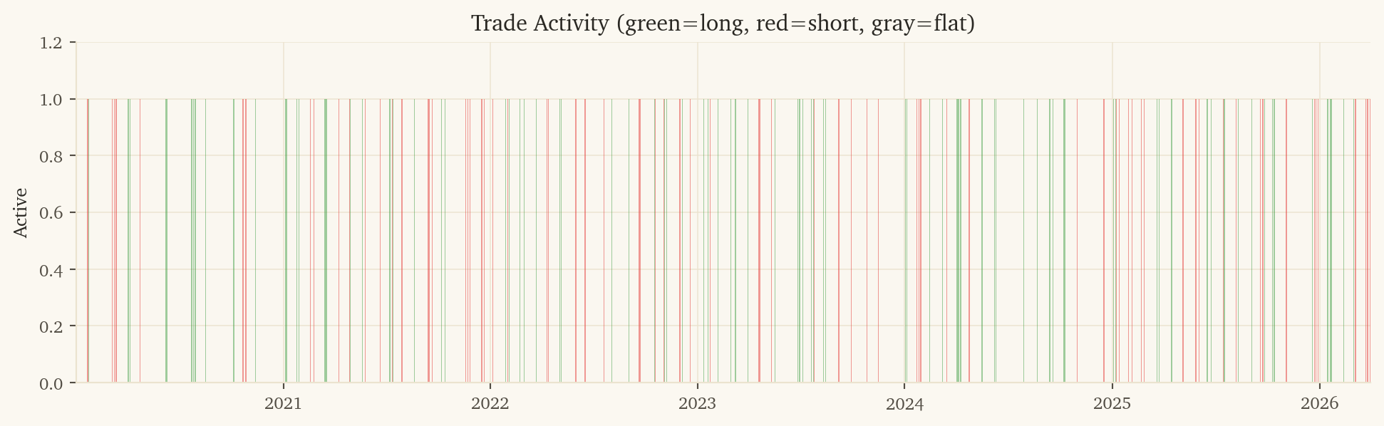 2. Trade frequency: Trades ~38% of days (258 trades out of 677 days). The corr_delta gate and confidence threshold filter about 62% of days.