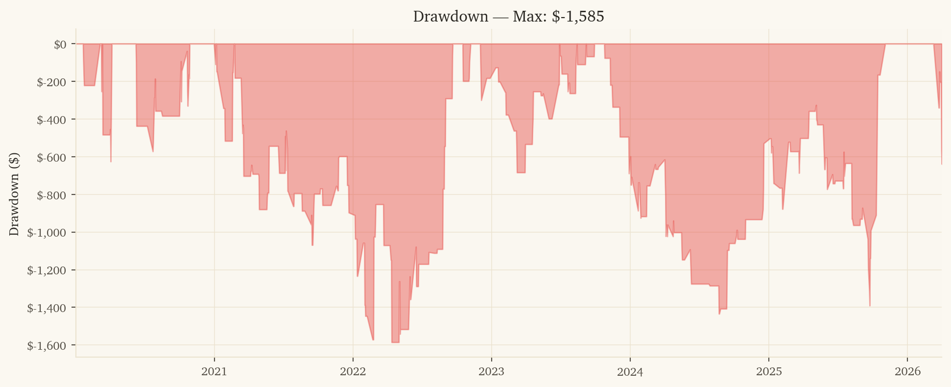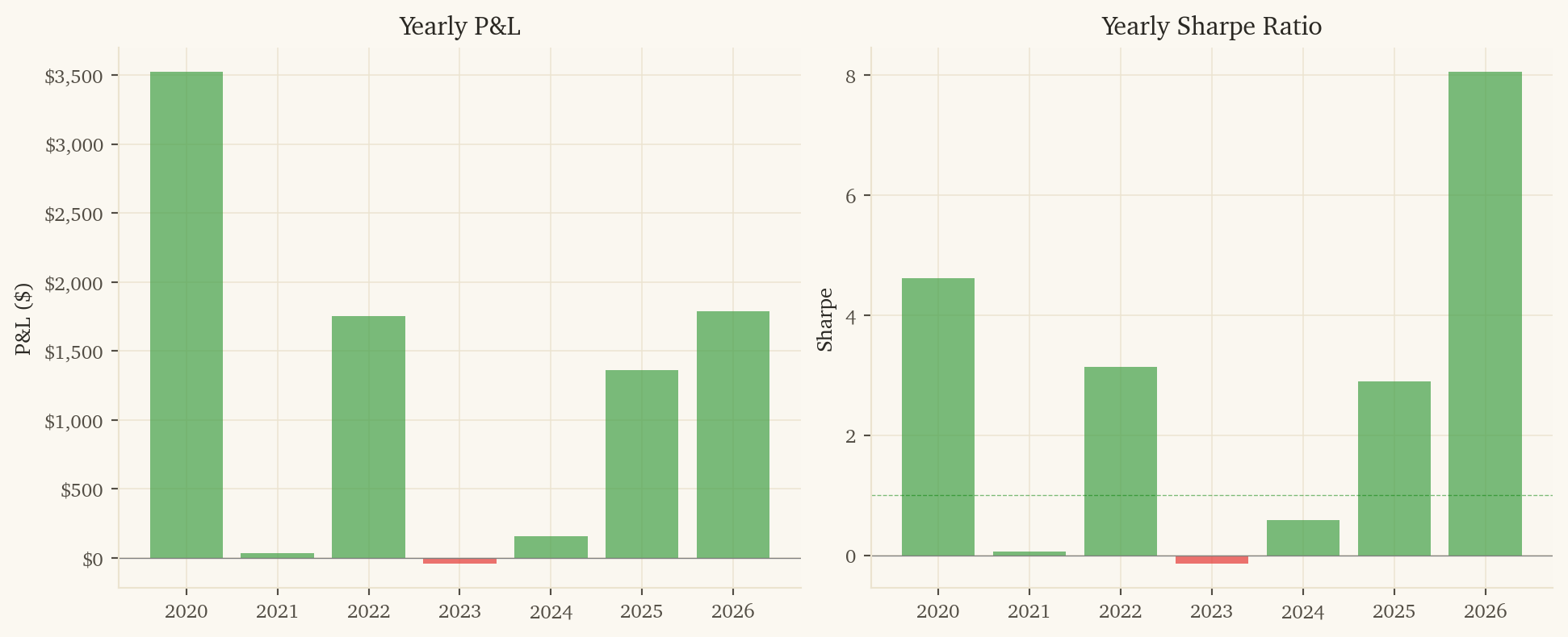 1. 2023 is near flat: The strategy makes -$39 in 2023 despite being profitable in all other post-2019 years. The 200-day window carries 2022 crisis data into early 2023 predictions.