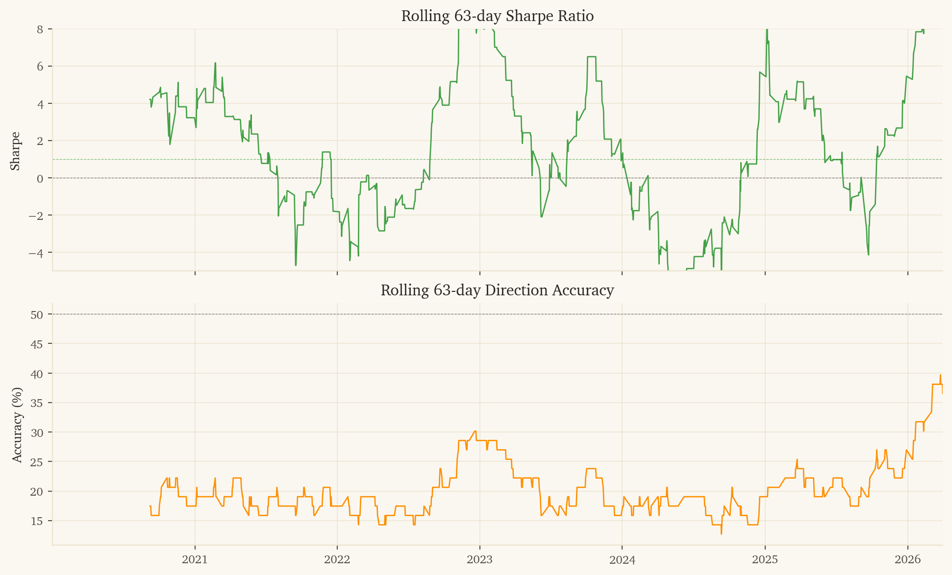 -- 5. Trade: sign(prediction) = direction, binary sizing