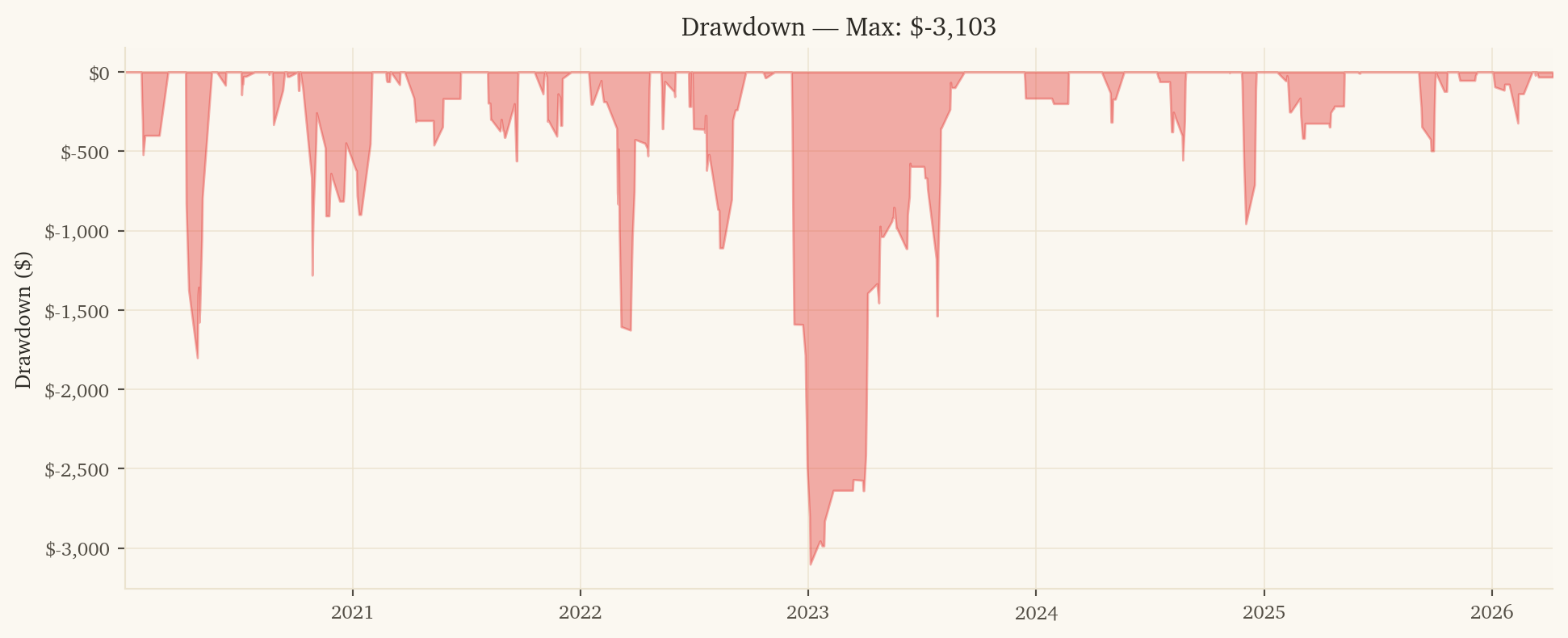 1. High dollar PnL but largest open exposure: 10-day hold periods mean the strategy is in position ~80% of the time. Capital is consistently deployed (vs daily-hold sleeves that are flat 50%+ of days).