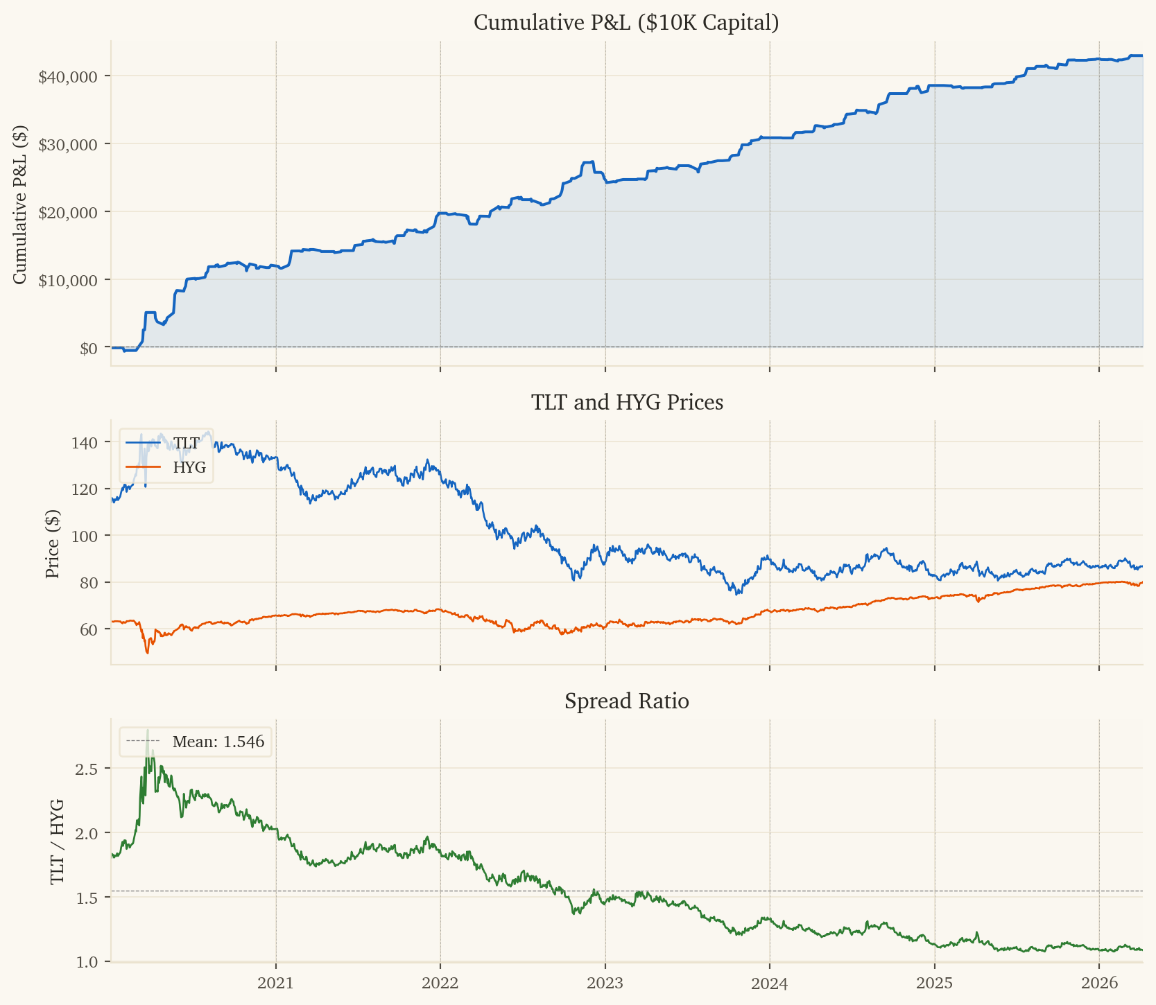 Figure 1: Cumulative P&L (top), TLT and HYG prices (middle), and spread ratio (bottom)